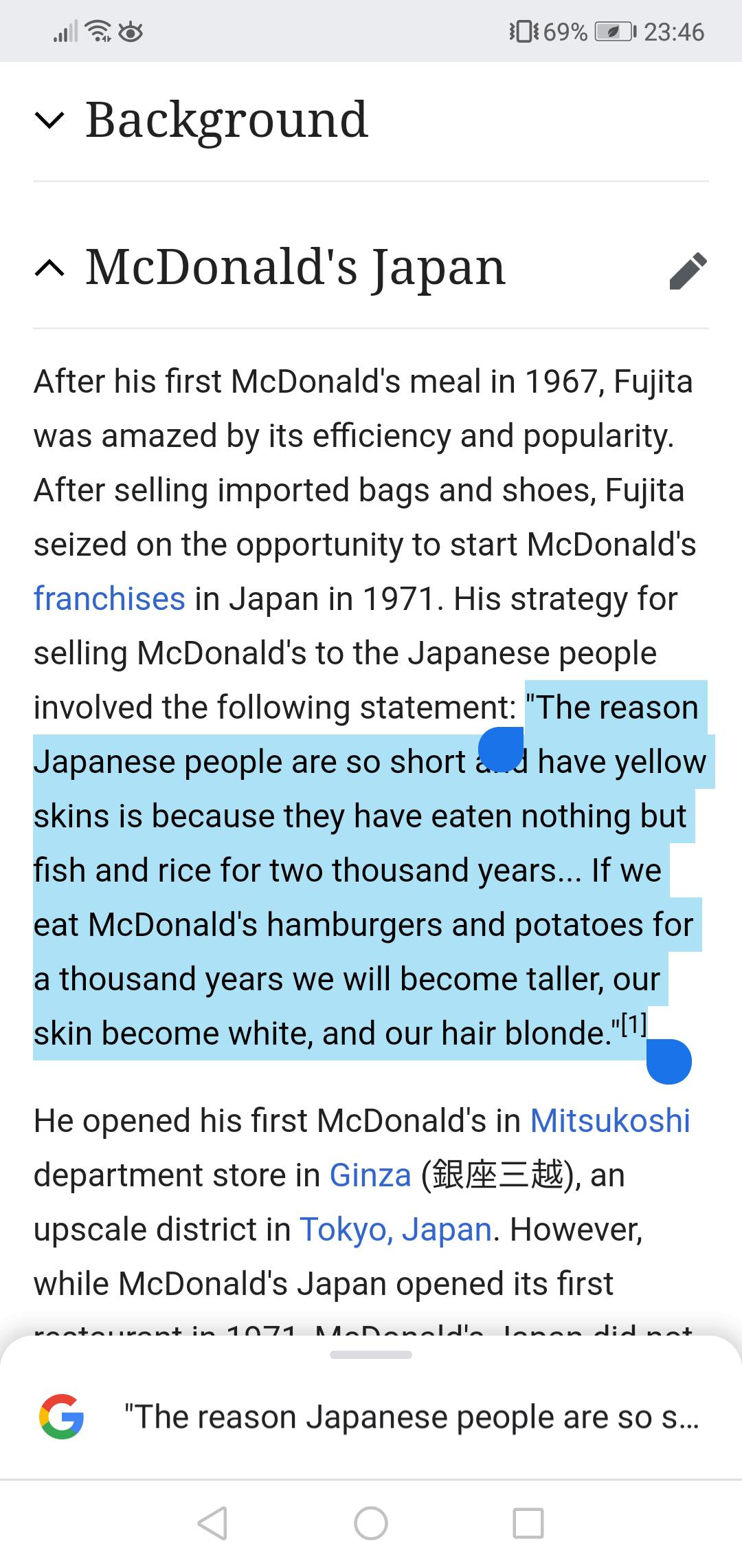 日本マクドナルド創業者「日本人がチビで黄色で醜いのは米と魚を食べるから。マックを食べれば白人のように色白、金髪、高身長になれる」