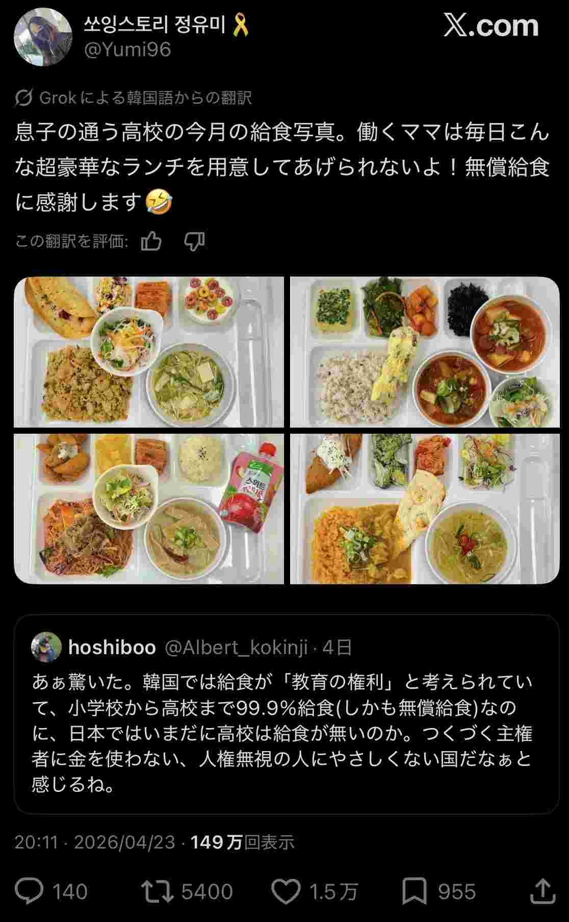 韓国の給食こんな豪華なんかよ