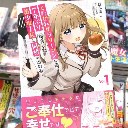 「くたびれサラリーマンな俺、7年ぶりに再会した美少女JKと同棲を始める」は、上村夏樹の小説を原作としたコミカライズ作品。激務に追われるくたびれたサラリーマン・天江雄也の家に、8歳年下の幼なじみ・白鳥葵がやって来たことから物語は始まる。幼い頃にした、大きくなったら雄也と結婚するという約束を信じ続けていた葵は花嫁修業もバッチリで、社会人なのにだらしない彼を家事でリード。あくまで保護者として振る舞おうとする雄也だが、葵からの猛烈アプローチに動揺を隠せない。結婚を前提にした、女子高生との同棲生活を描く甘々ラブコメが展開される。