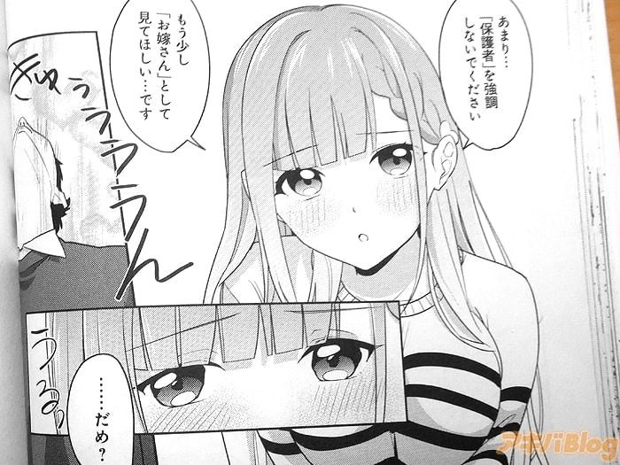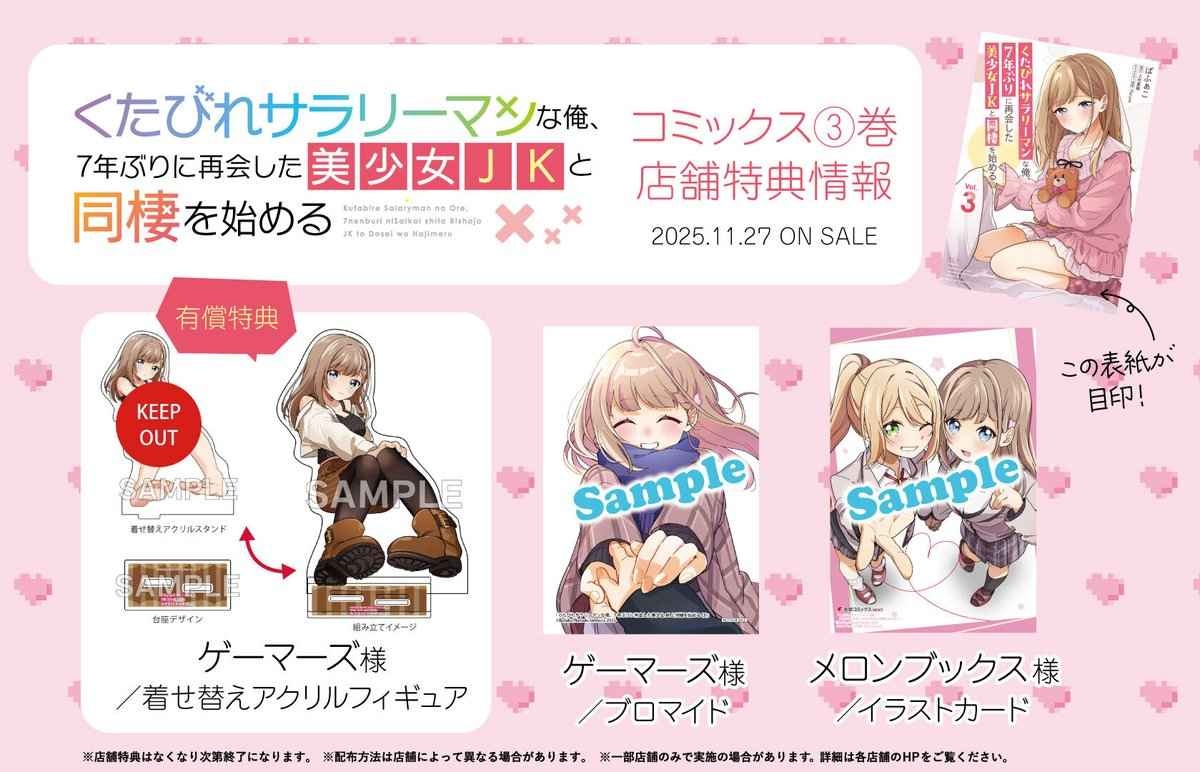 今回発売になった「くたびれサラリーマンな俺、7年ぶりに再会した美少女JKと~」1巻【AA】には第1話~第7話と、原作:上村夏樹氏の書き下ろしSS「新婚さんごっこ」を収録(目次)し、裏表紙は『JKとの同棲生活はなんでも一緒!お風呂も一緒!?』で、オビ謳い文句は『いつでもアナタにご奉仕できて幸せですっ?』、『幼馴染JKと結婚前提?同棲×甘々ラブコメ!』だった。