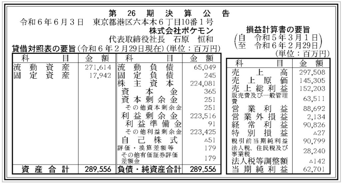 ポケモンの2024年2月期(第26期)の決算は、売上高2975億0800万円(前の期比26.9%増)、営業利益886億9200万円(同33.1%増)、経常利益908億2600万円(同31.5%増)、最終利益627億0100万円(同28.4%増)だった。6月3日付の『官報』に掲載された「決算公告」で判明した。