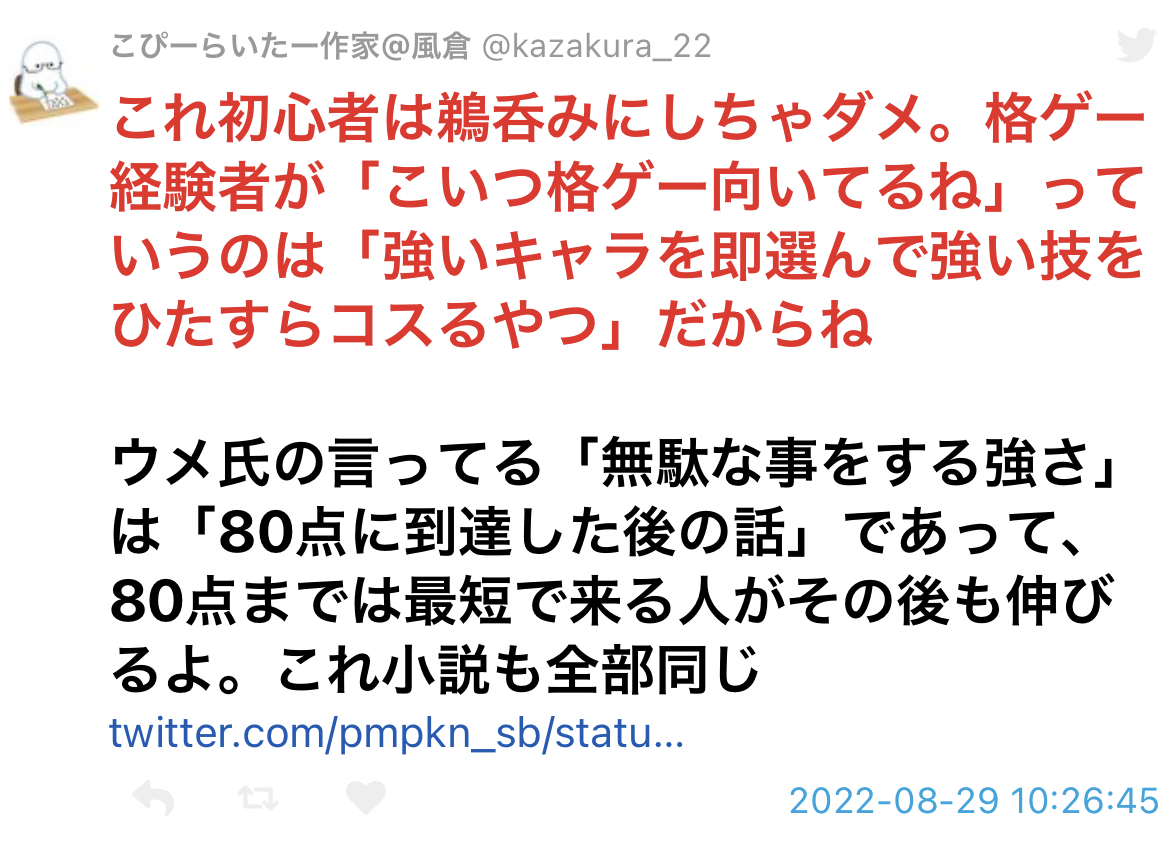 格ゲーガチ勢「格闘ゲームで強くなるには強キャラの強い技をひたすら使うこと。勝つ経験はなにより大事」