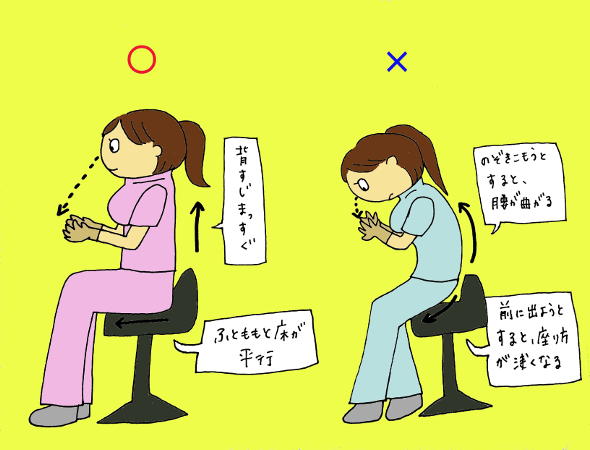 背筋をまっすぐ、肩の力を抜いて、ふとももを床と並行に、というのが歯科衛生士の基本姿勢とされているためです。