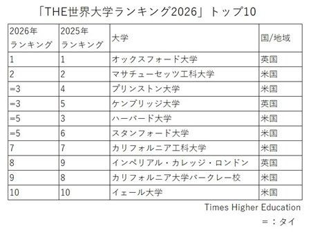 「THE世界大学ランキング2026」トップ10