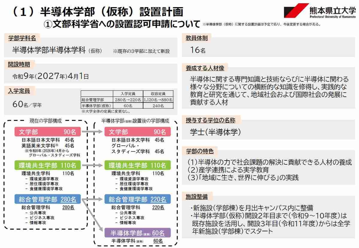 熊本県立大学は4月7日、理事長・学長記者会見を開き、「半導体学部(仮称)」を2027年4月1日に新設する計画に関する説明を行った。入学定員は1学年60人。