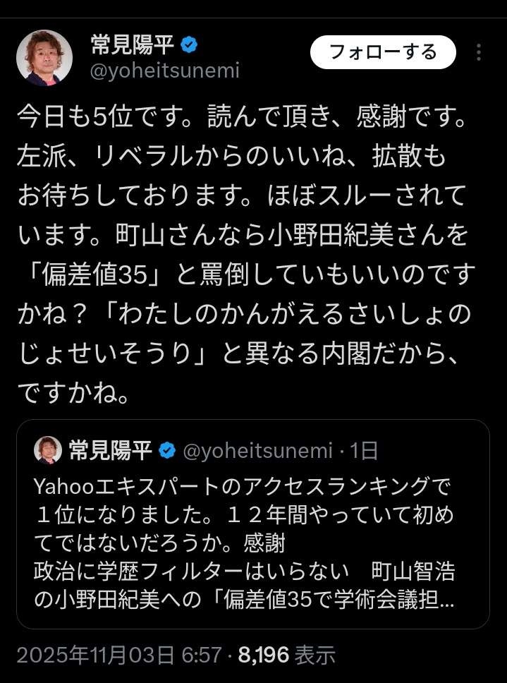 町山智浩が、日本学術会議関連の政策を担当する小野田紀美に関して「偏差値35で学術会議担当?」と投稿している。すでにSNS上では町山に対する批判が渦巻き、怒りが燎原の火のように燃え広がっている。