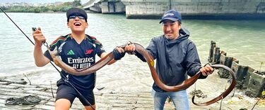 午前8時半、15センチのボラを餌にスタートした。1投目から15分後。最初は根掛かりと思った引きはどんどん強まり「ただ物じゃない」と確信した。激しい抵抗で釣り糸が切れないよう、汗だくになってさおを握り続けた。小雨の中、格闘は1時間も続いた。にょろにょろ動く細長い生き物が水面に現れた。必死にリールを巻いてもなかなか引き上がらず、その長さにびっくりした。