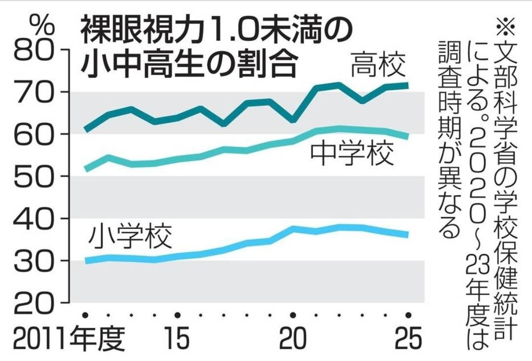 10年前と比べて小中高で5~7ポイントほど上昇し、近年視力低下が深刻となっている。文科省の担当者は「子どもを取り巻く環境が変化し、スマートフォンや本を近い距離で使用する機会が増えたことなどが背景にあるとみている」と分析。読書やスマホ使用などの際は30センチ以上離すといった対策を呼びかけている。