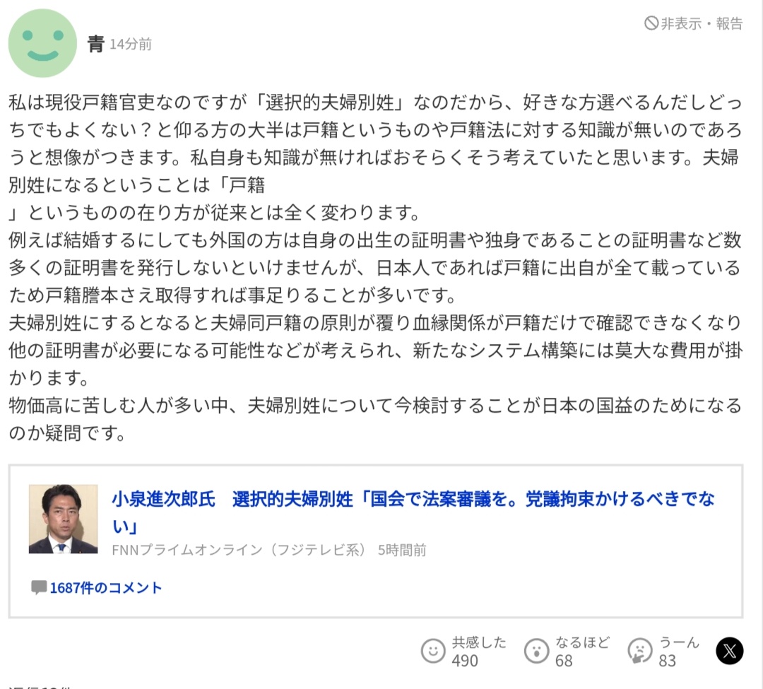 旧姓使用の浸透具合を見たら別姓にする合理的理由はあるだろ - 33 名前:番組の途中ですが翡翠の名無しがお送りします 投稿日時:2025/03/09(日) 20:41:48.21 ID:FIjqyJ5/0