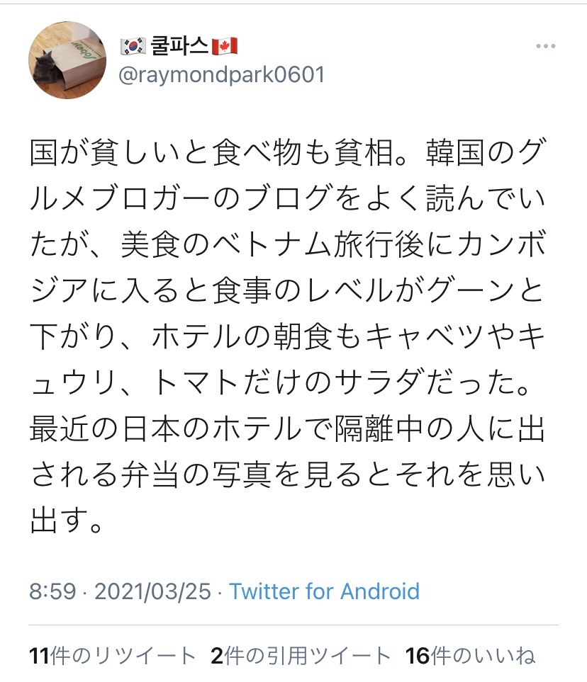 韓国人「国が貧しいと食べ物も貧しくなる。最近の日本のホテルで隔離中に出される弁当を思い出す」