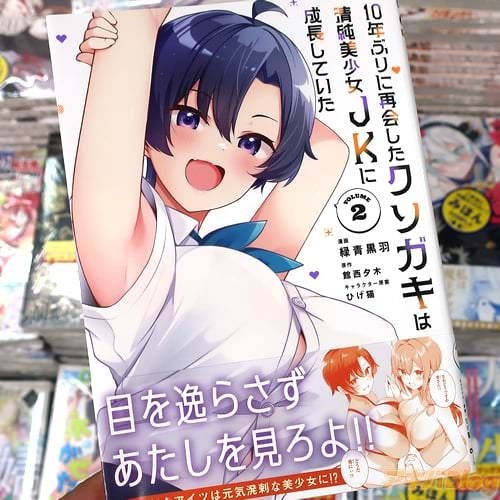 コミカライズ「10年ぶりに再会したクソガキは清純美少女JKに成長していた」2巻【AA】には、第7話から第13話と書き下ろし小説「クソガキと魔法少女」を収録(もくじ)し、オビ謳い文句は『目を逸らさずあたしを見ろよ!』、『生意気なアイツは元気溌剌な美少女に!?』で、裏表紙は『10年ぶりの青春が蘇る年の差ラブコメ、第2幕!』、『美少女のアピールが止まらない!』などだった。