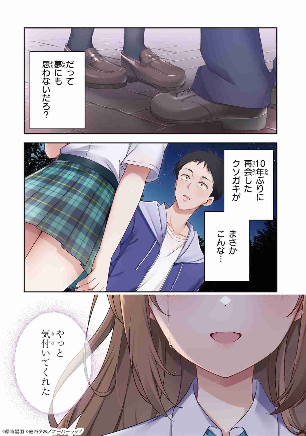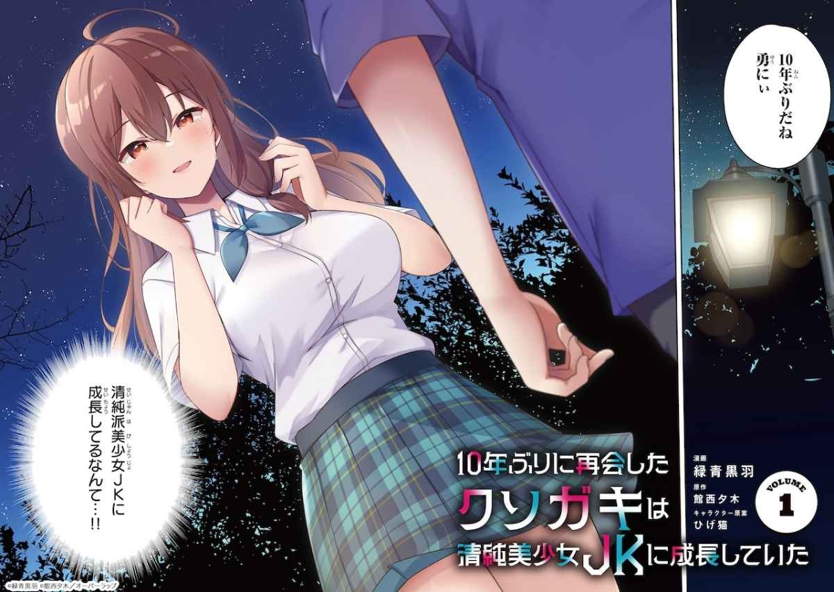 「10年ぶりに再会したクソガキは清純美少女JKに成長していた」は、館西夕木の小説を原作としたコミカライズ作品。過労で倒れたことをきっかけにブラック企業を退職した主人公・有月勇は、10年ぶりの帰郷を果たす。地元に到着して思い出すのは、自分に懐いていた3人の“クソガキ”のこと。今頃はどんな姿に成長しているかと想像をしていると、目の前に現れた謎の美少女に「私の名前を当ててみてください」と難題を突きつけられる。会ったばかりなのに名前などわかるわけがないと困る勇だが、実はその美少女こそかつてのクソガキ・春山未夜だった。正体に気が付かない勇と、彼の方から気がついてほしい未夜の年の差ラブコメが展開される。