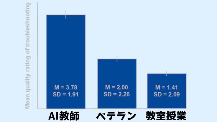 すると最終テストにおいて、人間による普通の教室授業を受けた生徒たちは平均して問題の38%のみしか解決でず、ベテランたちが解決できた問題も全体の52%に留まっていましたがAI教師による個別指導を受けた生徒たちは平均して全問題の74%を解決することができたことが判明します。