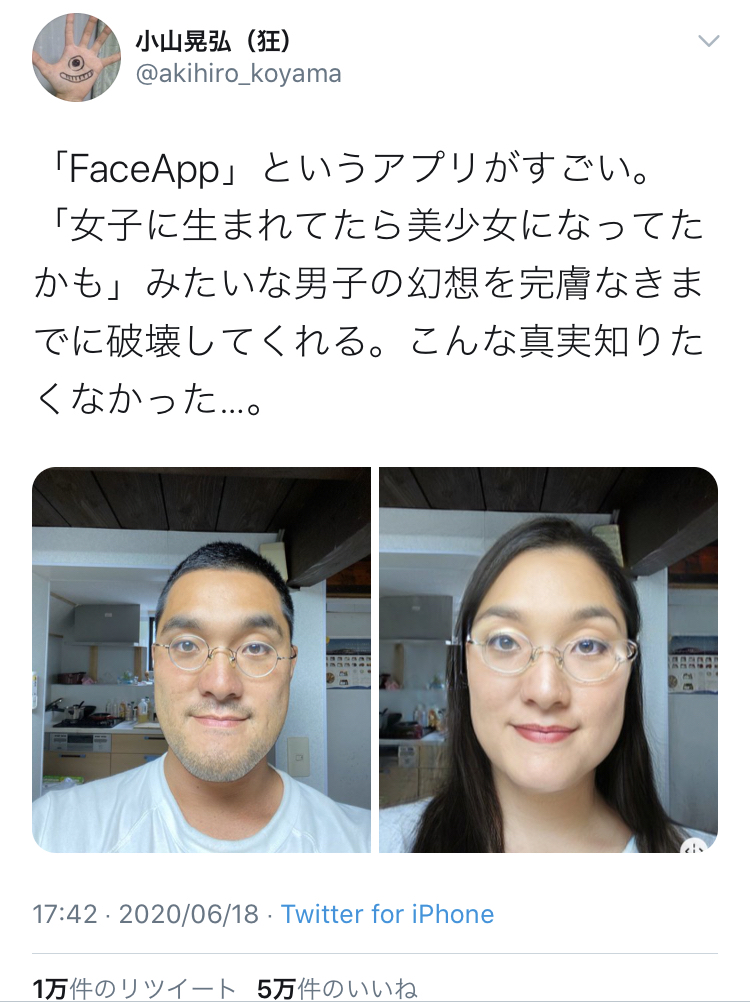 FaceAppというアプリがすごい。「女子に生まれてたら美少女になってたかも」みたいな男子の幻想を完膚なきまでに破壊