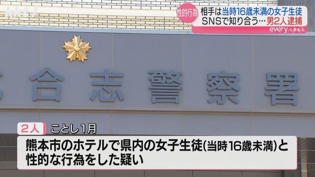 警察によりますと、御船町の水口泰自郎容疑者(47、児童福祉法違反の疑いでも逮捕)と福岡県大牟田市の諸藤瑛容疑者(23)はことし1月、熊本市のホテルで当時16歳未満だった県内の女子生徒と性的な行為をした疑いがもたれています。また水口容疑者は女子生徒に諸藤容疑者へのみだらな行為をさせた疑いももたれています。