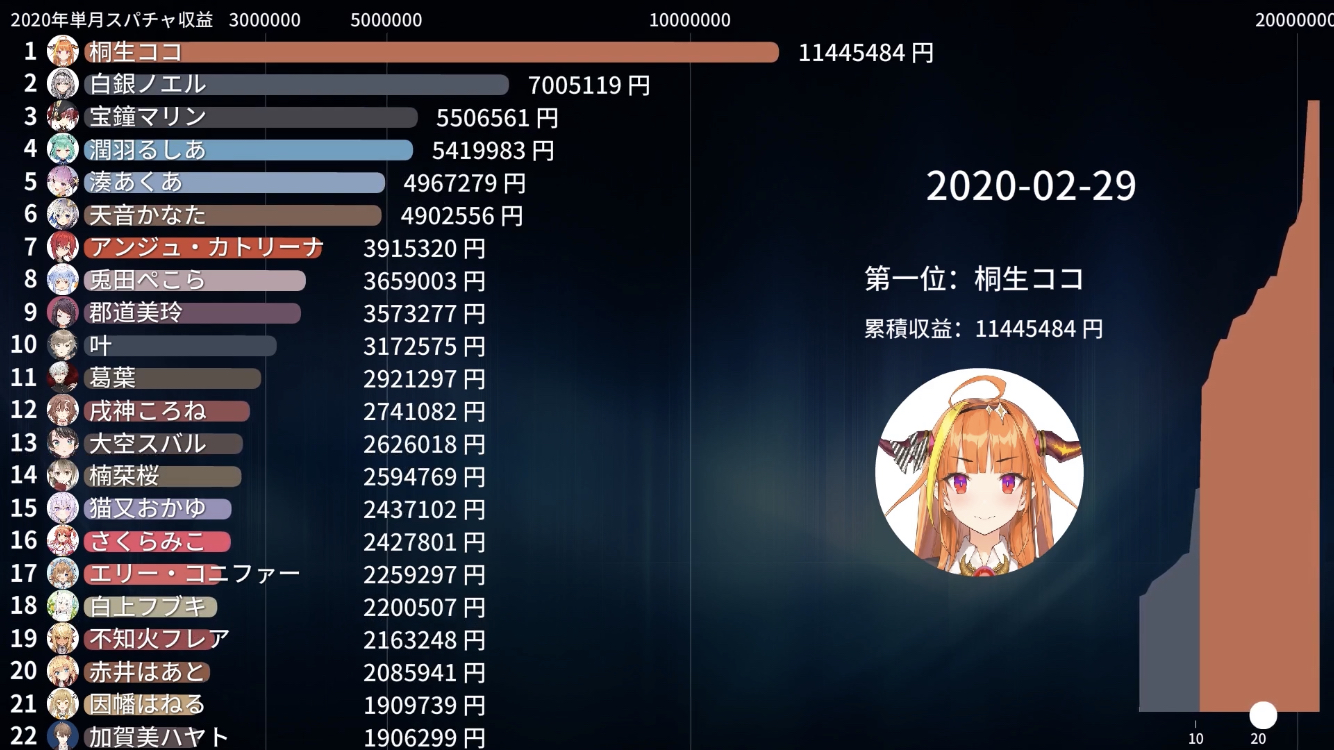 Vtuberさんの2月の月間スパチャランキングが発表されたぺこ。一位の金額はなんと!※画像あり
