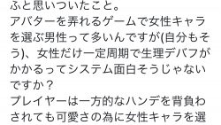 嫌儲ちんぽ騎士団「キモオタがゲームで女性キャラを選ばないように女性キャラは一定周期で雑魚になる「生理デバフ」を実装しろ!」