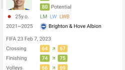 【悲報】三笘のゲームの能力値77(最大値100)