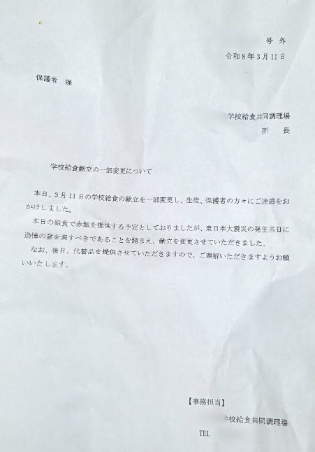 「学校給食献立の一部変更について」と題するその用紙には、「本日の給食で赤飯を提供する予定としておりましたが、東日本大震災の発生当日に追悼の意を表すべきであることを踏まえ、献立を変更させていただきました。