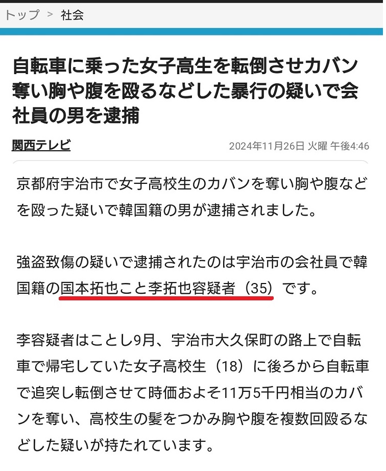 京都府宇治市で女子高校生のカバンを奪い胸や腹などを殴った疑いで韓国籍の男が逮捕されました。強盗致傷の疑いで逮捕されたのは宇治市の会社員で韓国籍の国本拓也こと李拓也容疑者(35)です。
