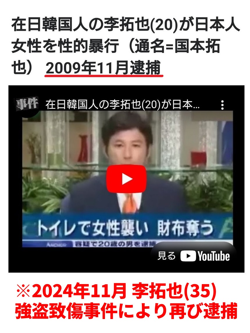 【在日】 在日韓国人の李拓也が女子高生から強盗 以前にもレイプ事件の前科有 【強制送還】