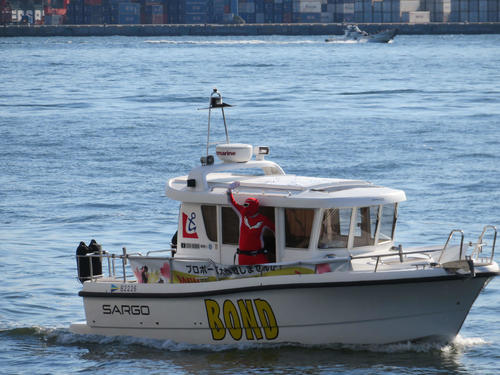 続いて午後12時40分ごろ、小さな船がダイヤモンド・プリンセスに接近した。船には、特撮戦隊もののような