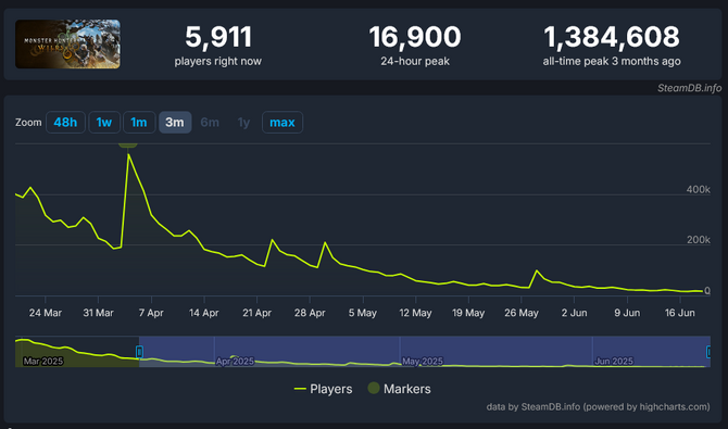 カプコンの新作モンハンが「圧倒的に不評」を記録。同接138万人から1.7万人に激減へ