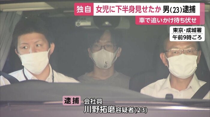 https://www.fnn.jp/articles/-/882427会社員の川野拓磨容疑者(23)は4月、東京・世田谷区内のマンションの駐輪場で面識のない小学生の女の子に対し、ロングコートの中から下半身を見せた疑いがもたれています。