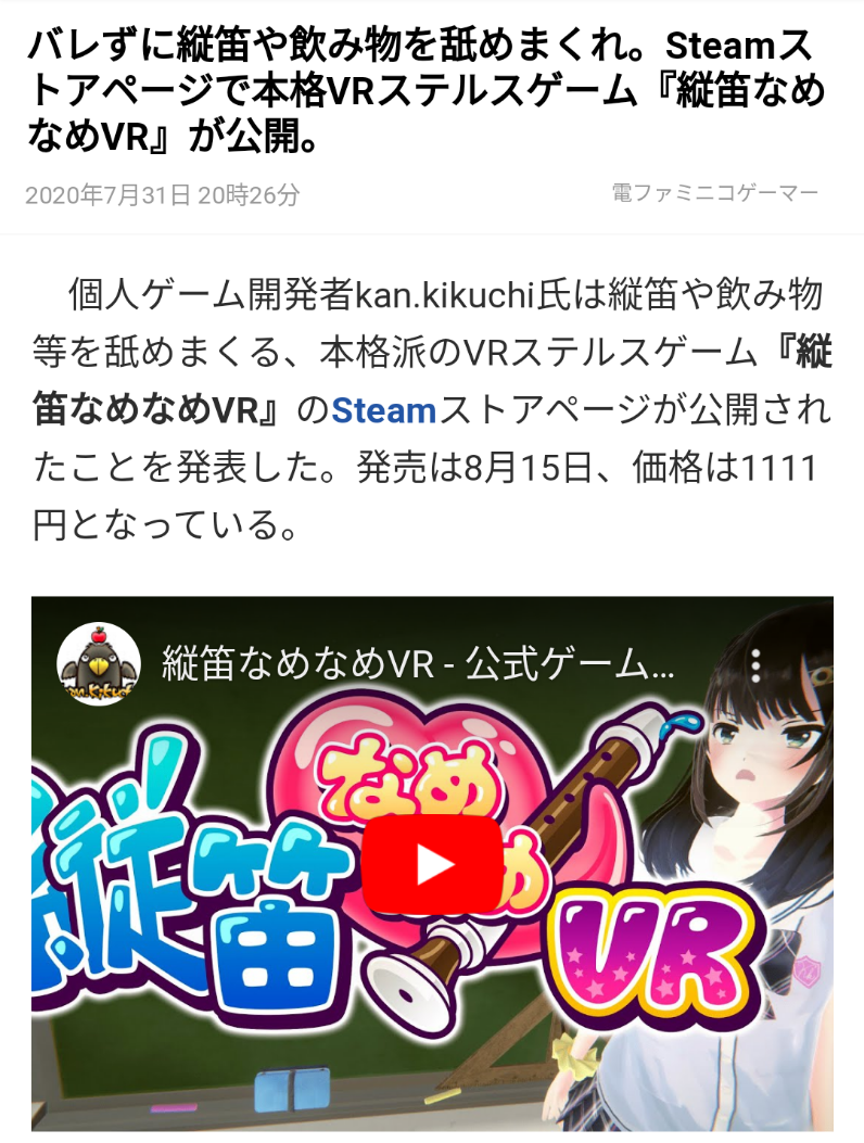 個人ゲーム開発者kan.kikuchi氏は縦笛や飲み物等を舐めまくる、本格派のVRステルスゲーム『縦笛なめなめVR』のSteamストアページが公開されたことを発表した。発売は8月15日、価格は1111円となっている。
