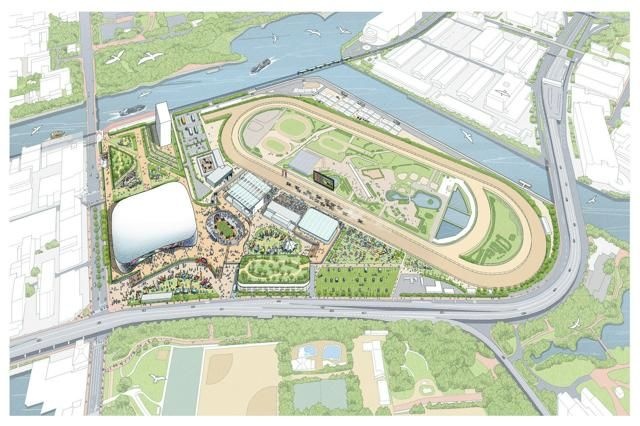 19日発表した中期経営計画では、「競馬だけでなく、スポーツ・ライブを楽しめる都心型エンターテインメント競馬場を実現」する方針を表明。厩舎(きゅうしゃ)などを場外へ移転して競馬場全体を再整備し、現在は駐車場などがある敷地の北西側にアリーナを配置したイメージ図を公表した一方、「具体的な配置は今後検討する」という。