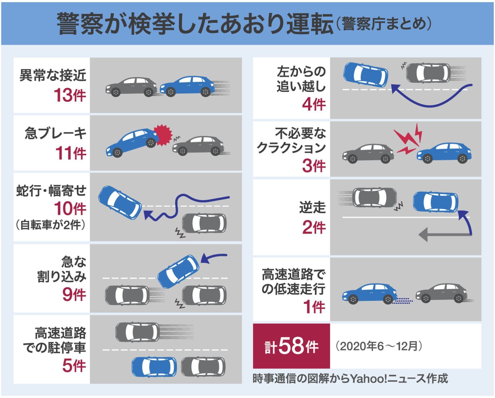 ※この記事、図解は時事通信社の記事を元にYahoo!ニュースが作成したものです。出典記事は「あおり運転、58件検挙 異常接近が最多、自転車も―厳罰化後半年・警察庁(2021年2月25日)」