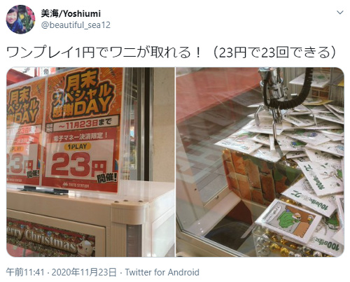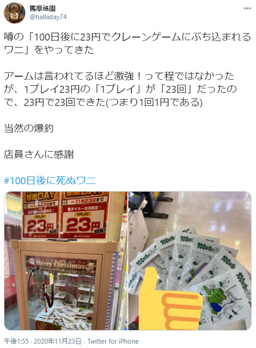 つい先日お伝えした、『100日後に死ぬワニ』が1回23円のクレーンゲーム行きになった件。しかしながら実際は1回23円ではなかったことが発覚した。遊んだ人の証言にとると「23円で23回できる」、