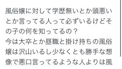 風俗嬢「風俗嬢=バカって考えやめな。今は大卒とか昼職掛け持ちの嬢は沢山いる、少なくともお前らより学歴あるよ」