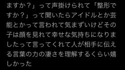 ま●こ「JKから彫刻みたいな顔ですね。って言われて整形ですか?って聞いたら、いやアイドルとか。と言われて言葉の力が嬉しかった。」