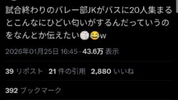 嫌儲さやか「試合終わりのバレー部JKがバスに20人集まるとこんなにひどい匂いがするんだっていうのをなんとか伝えたい😂w」
