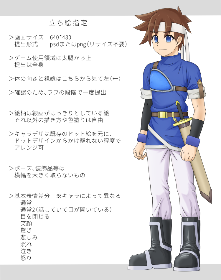 立ち絵は基本的に斜めを向いている立ち絵。ポーズは弓を構えて戦闘態勢のものを描いていただきたいです