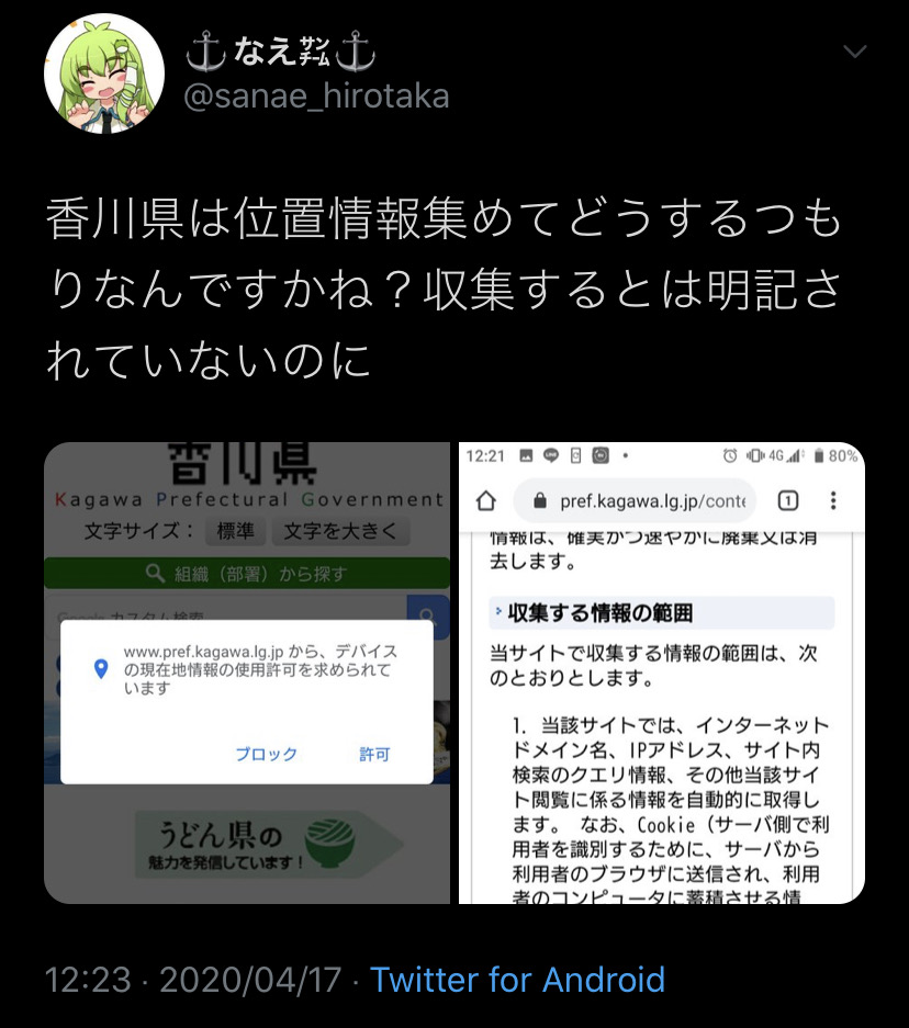 位置情報を集め始める香川県- 21 名前:番組の途中ですが翡翠の名無しがお送りします 投稿日時:2020/05/01(金) 09:19:48.028 ID:1/zdYDAWa