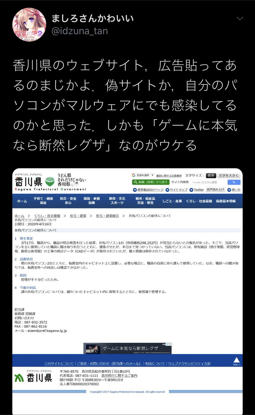 香川県のホームページにアフィ広告ペタッw- 11 名前:番組の途中ですが翡翠の名無しがお送りします 投稿日時:2020/05/01(金) 09:17:49.145 ID:FjWedDyn0