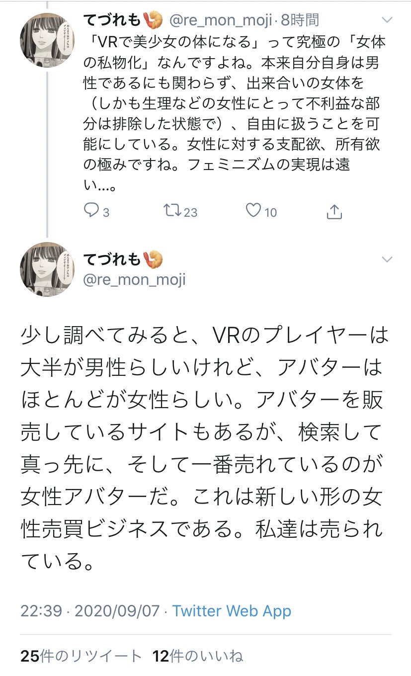 - てづれもが女性アバターの可能性は?