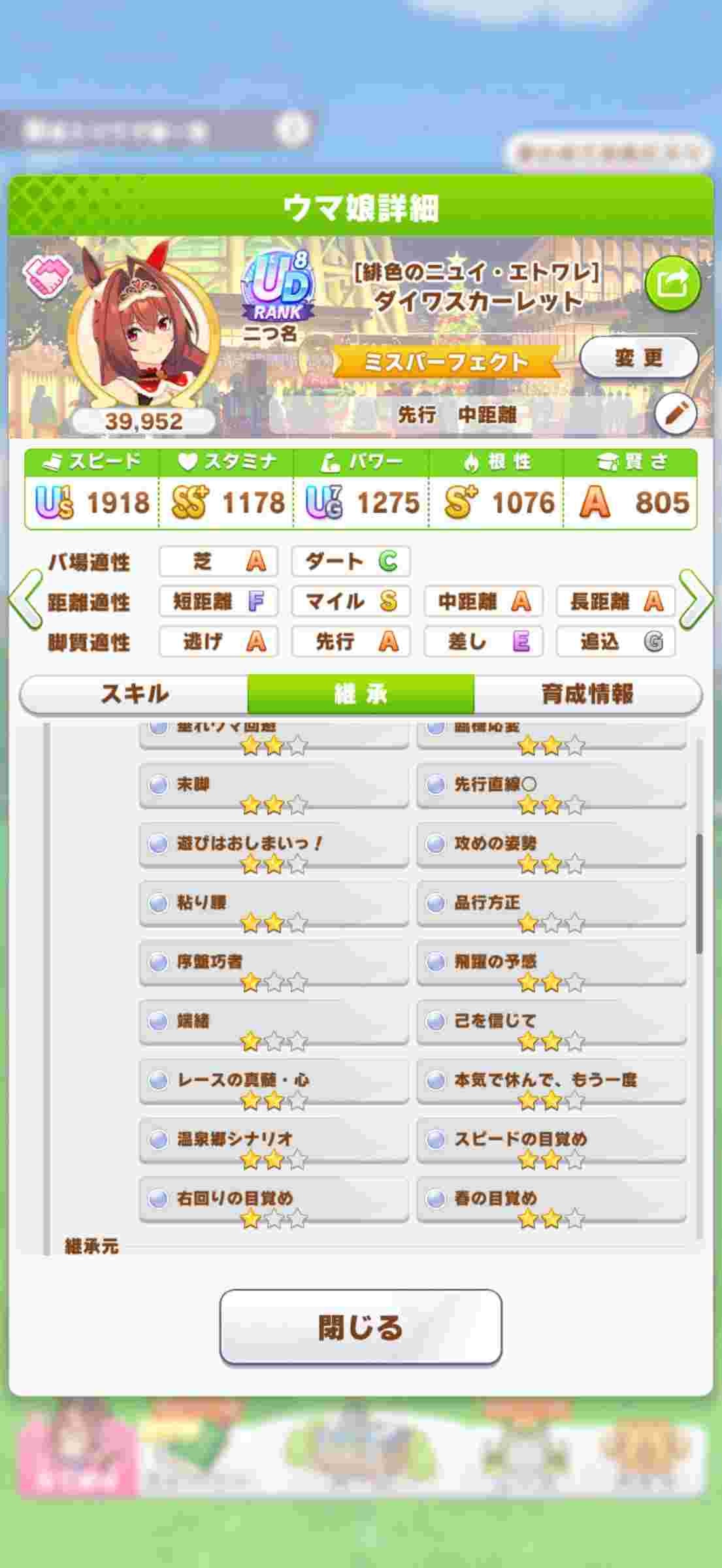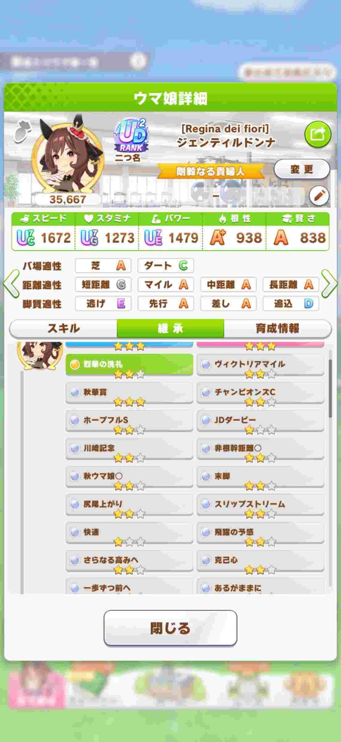 アニバガチャで運良く水着メジマさん引けたのと集中、先行のコツを素で持ってて三冠路線も菊花賞に出るだけだからティアラ路線の子と相性いいかなぁって