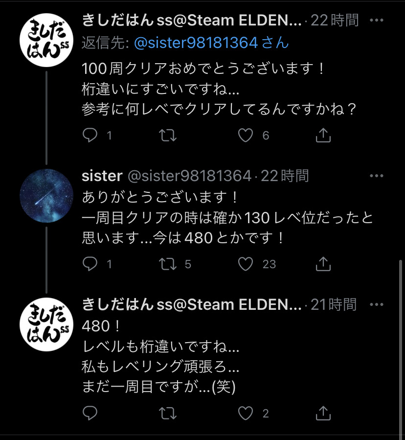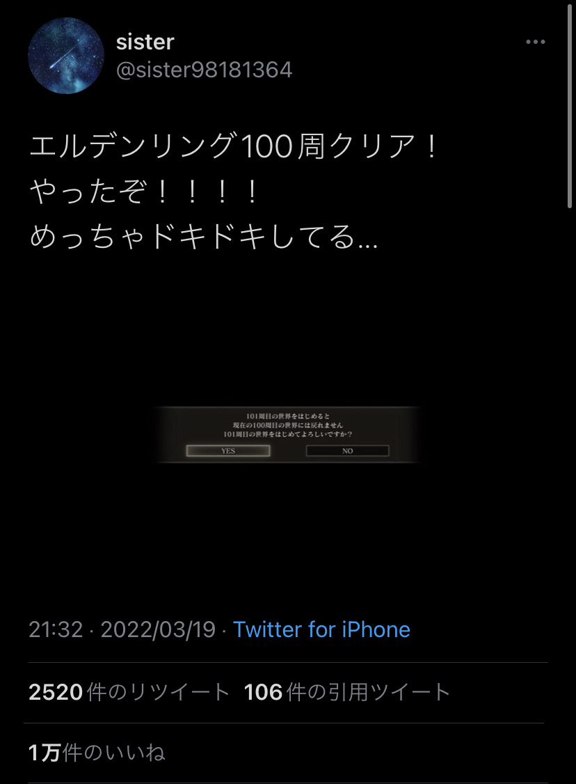 フロムゲーファン「エルデンリング100周目クリアしました!!!1000周を目指します!!」